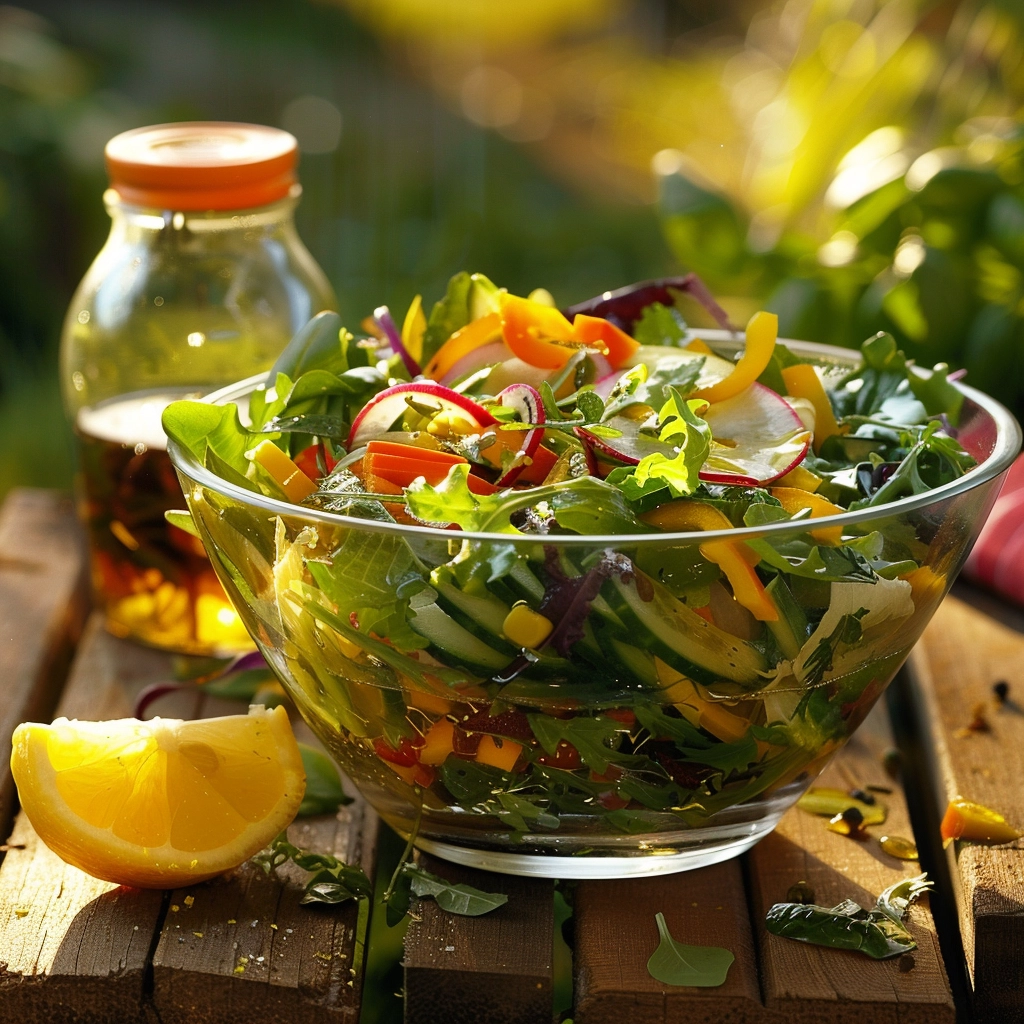 Assembly: In a large mixing bowl, combine the mixed greens, cucumber, carrots, bell pepper, cherry tomatoes, and sliced onion. Drizzle the dressing over the salad. Toss everything together until the vegetables are evenly coated with the vinaigrette.